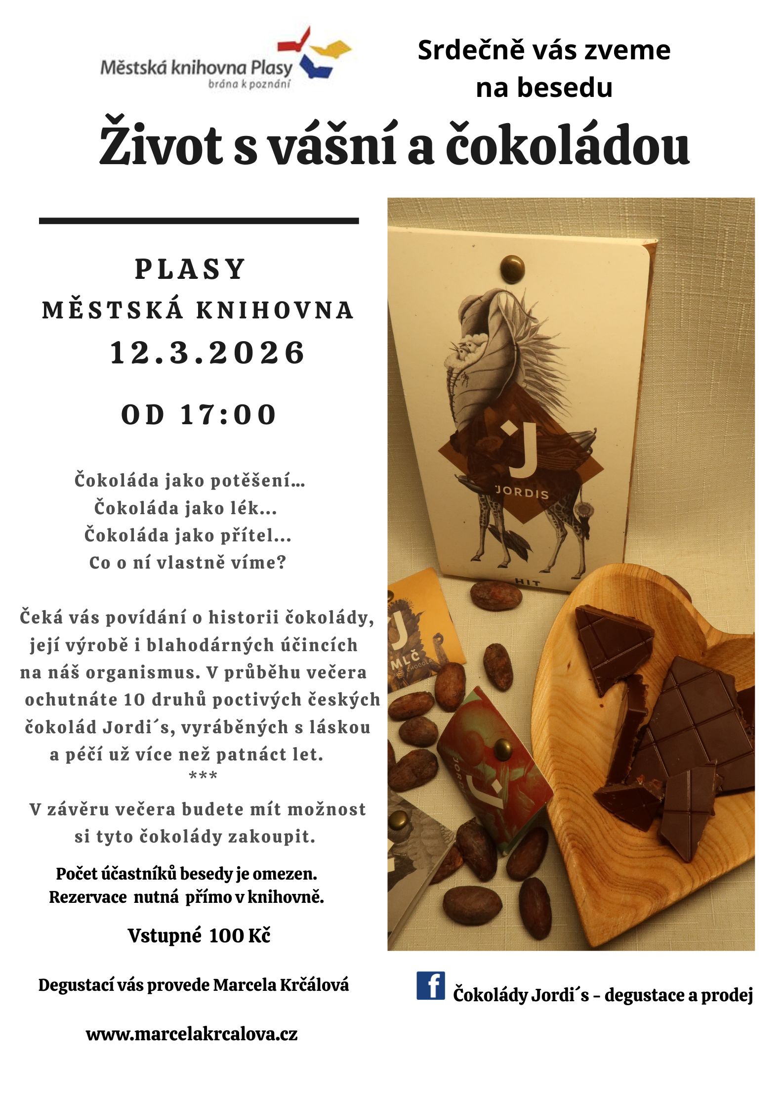 Povídání o historii čokolády a její výrobě. V průběhu večera ochutnáte 10 druhů čokolády Jordi´s. Je nutné se na akci přihlásit předem, počet míst je omezen.